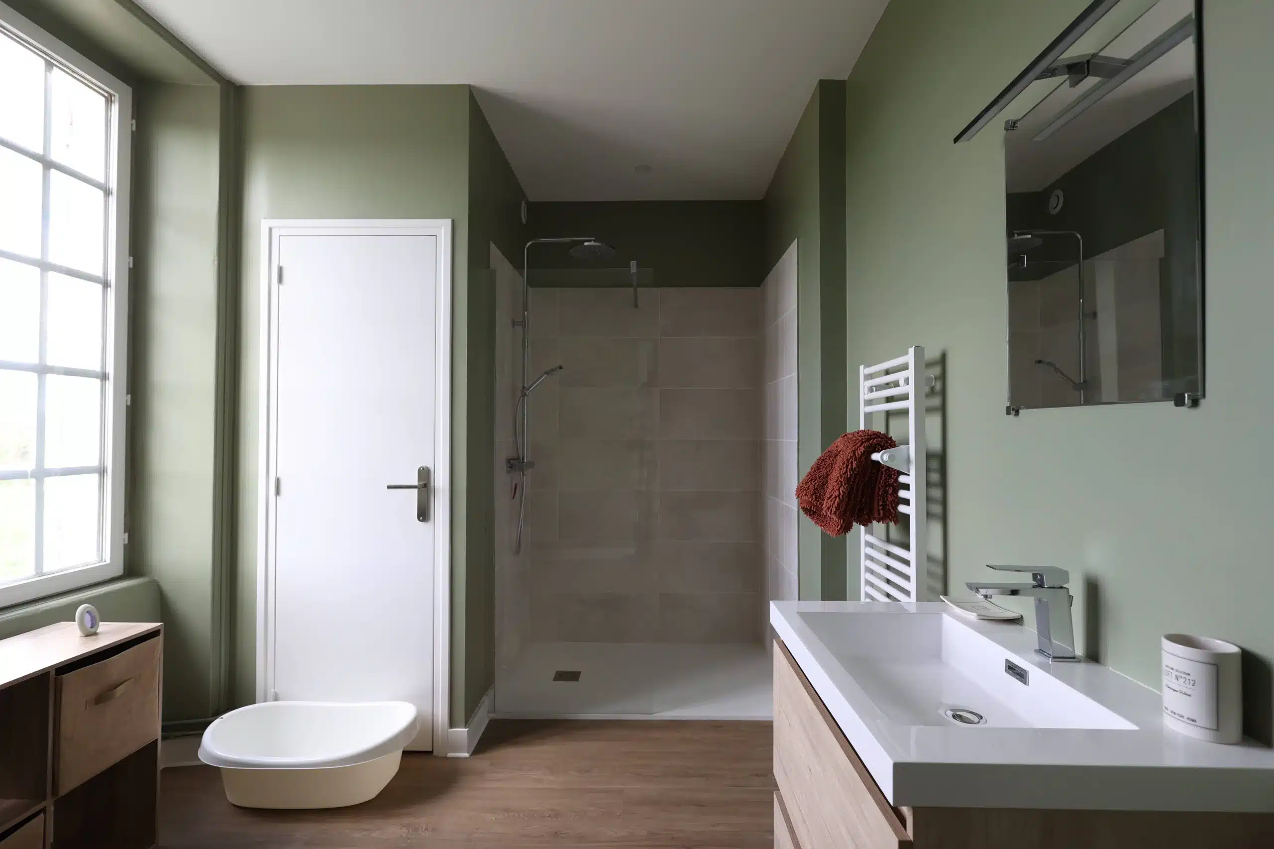 - 1 salle de bain à l’étage avec douche, baignoire, lavabo et table à langer